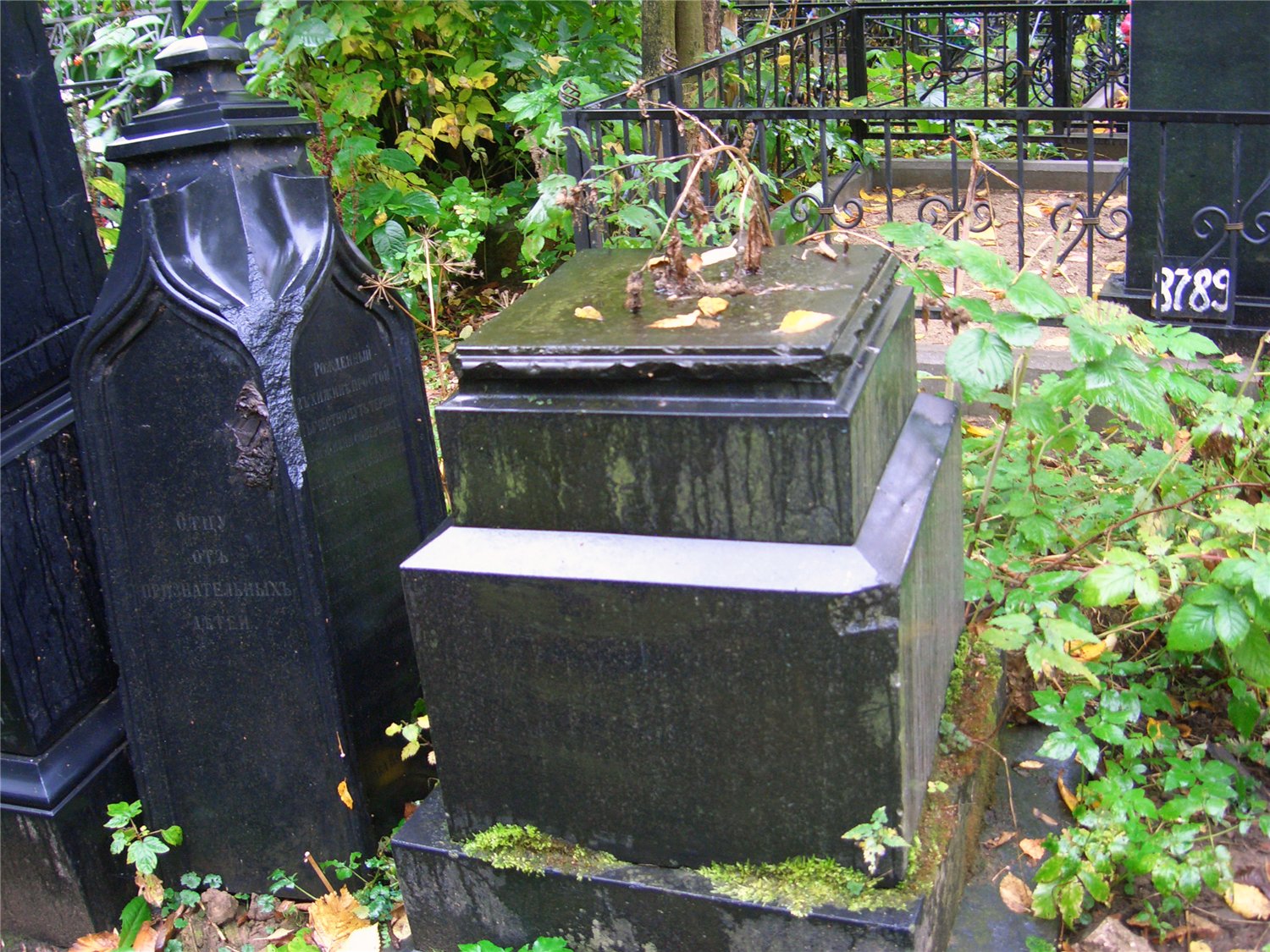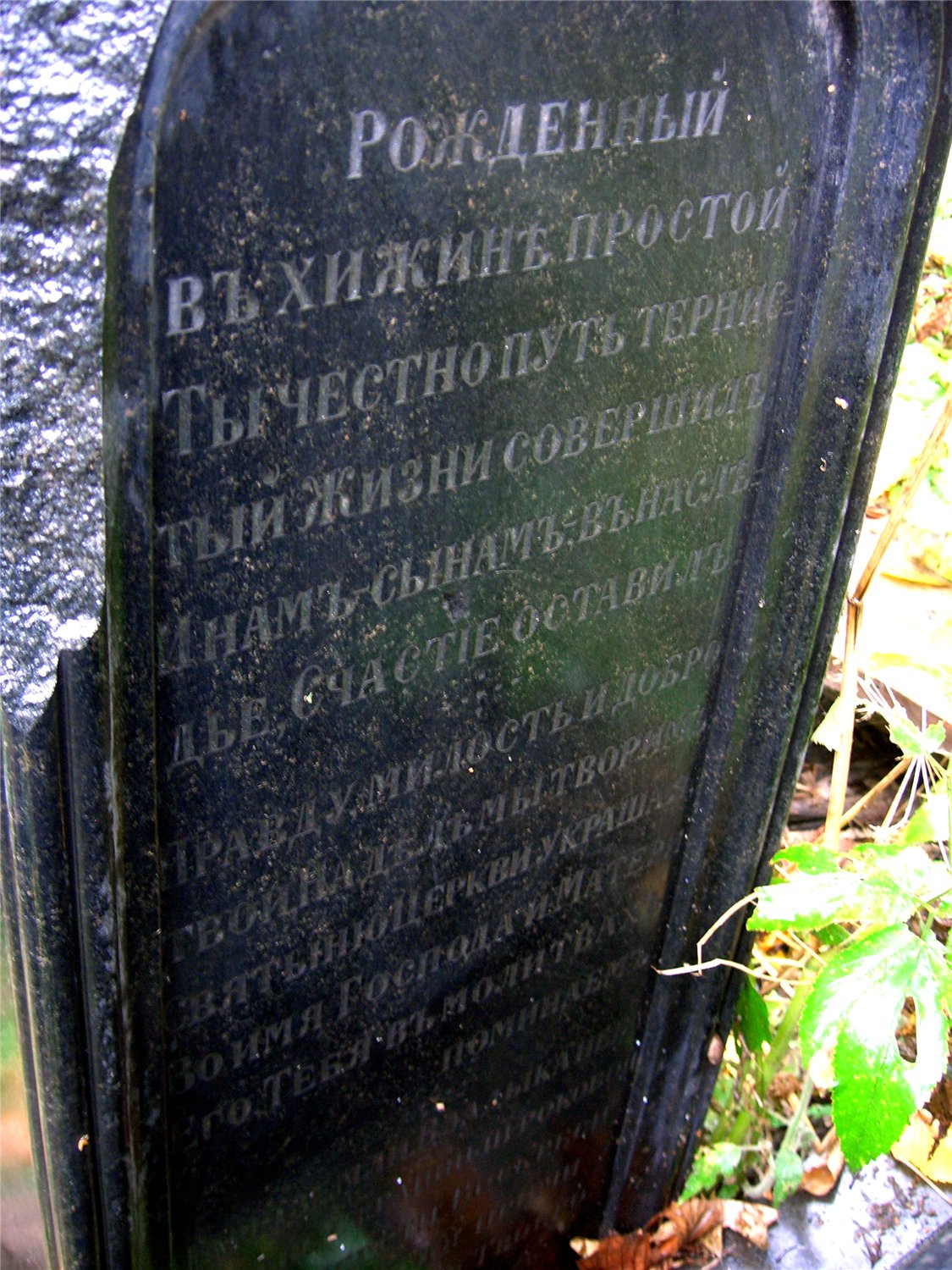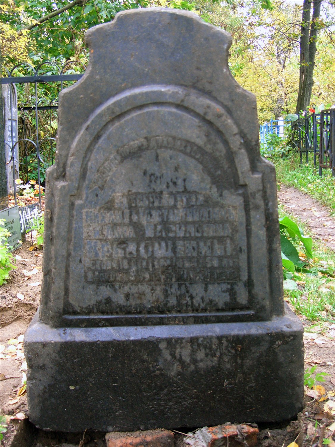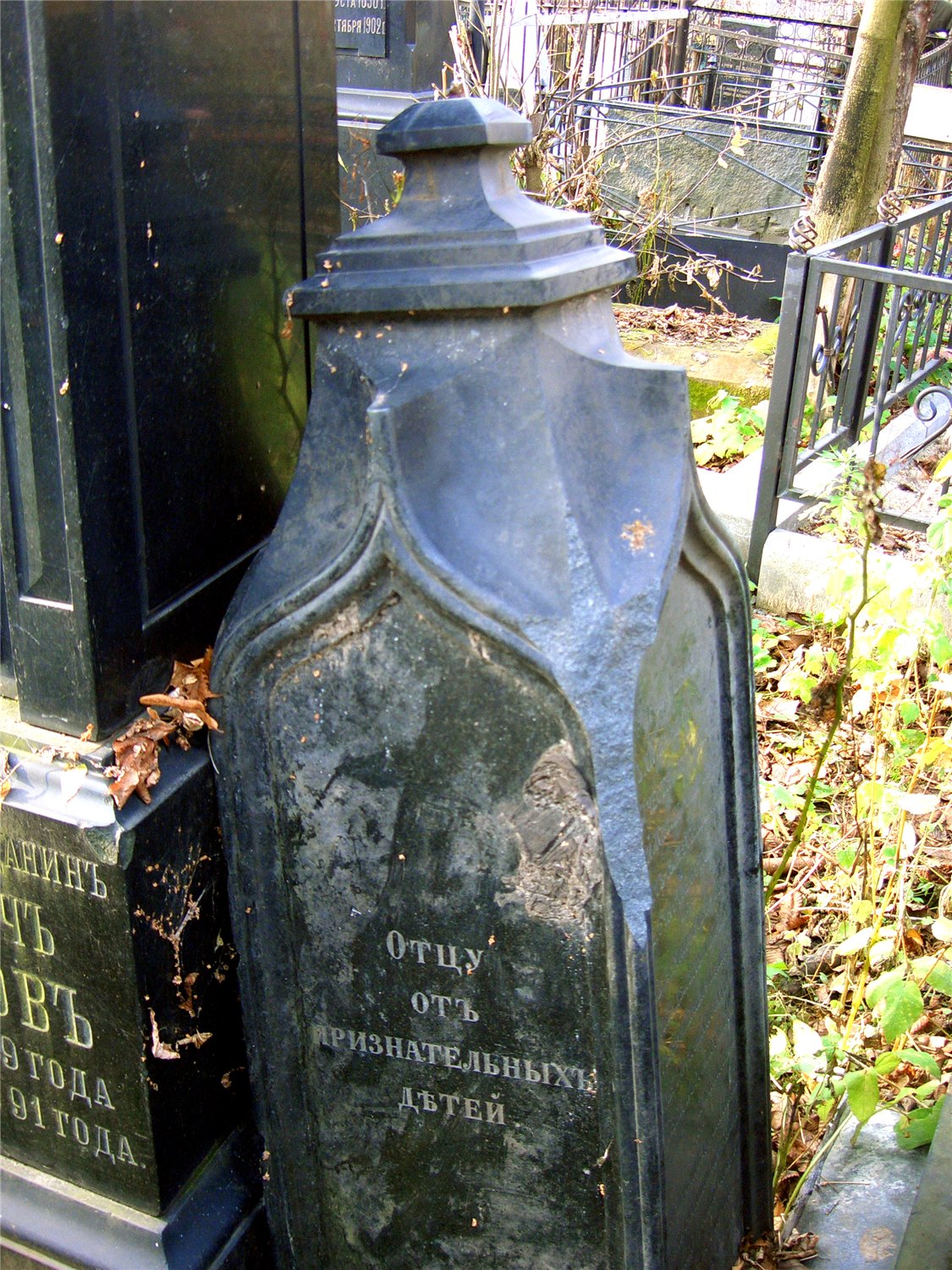 Одна из граней не читаема, верх надгробия повален и прислонён этой гранью к соседнему памятнику.