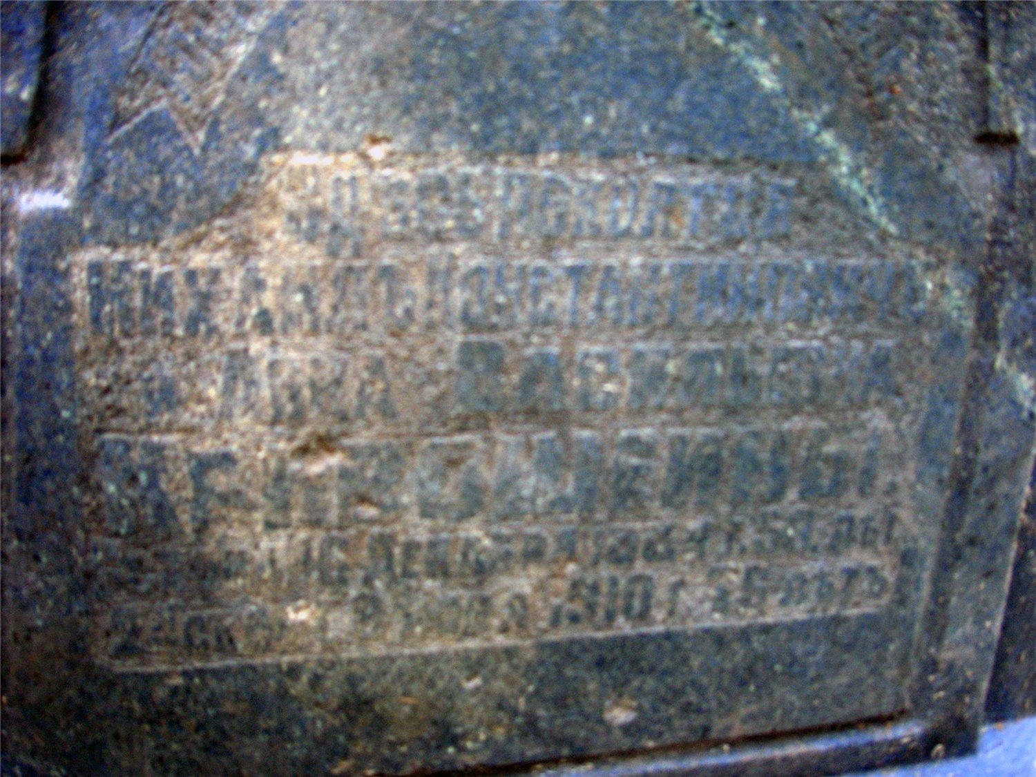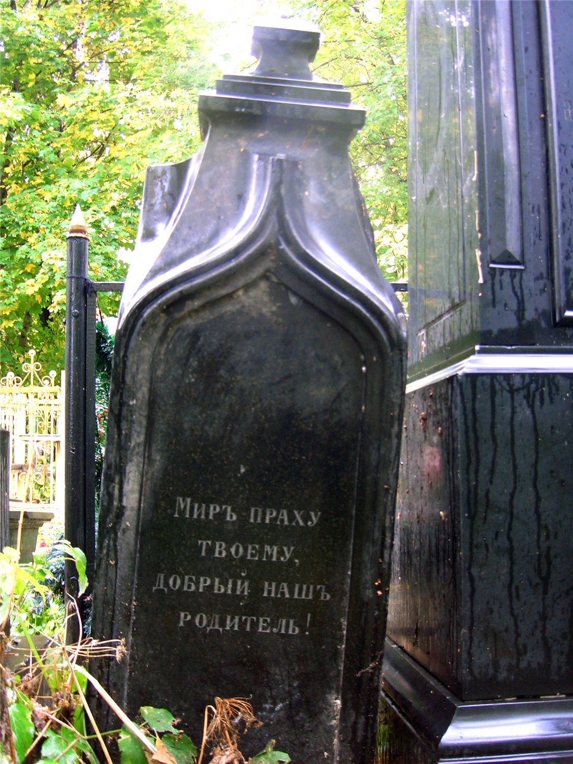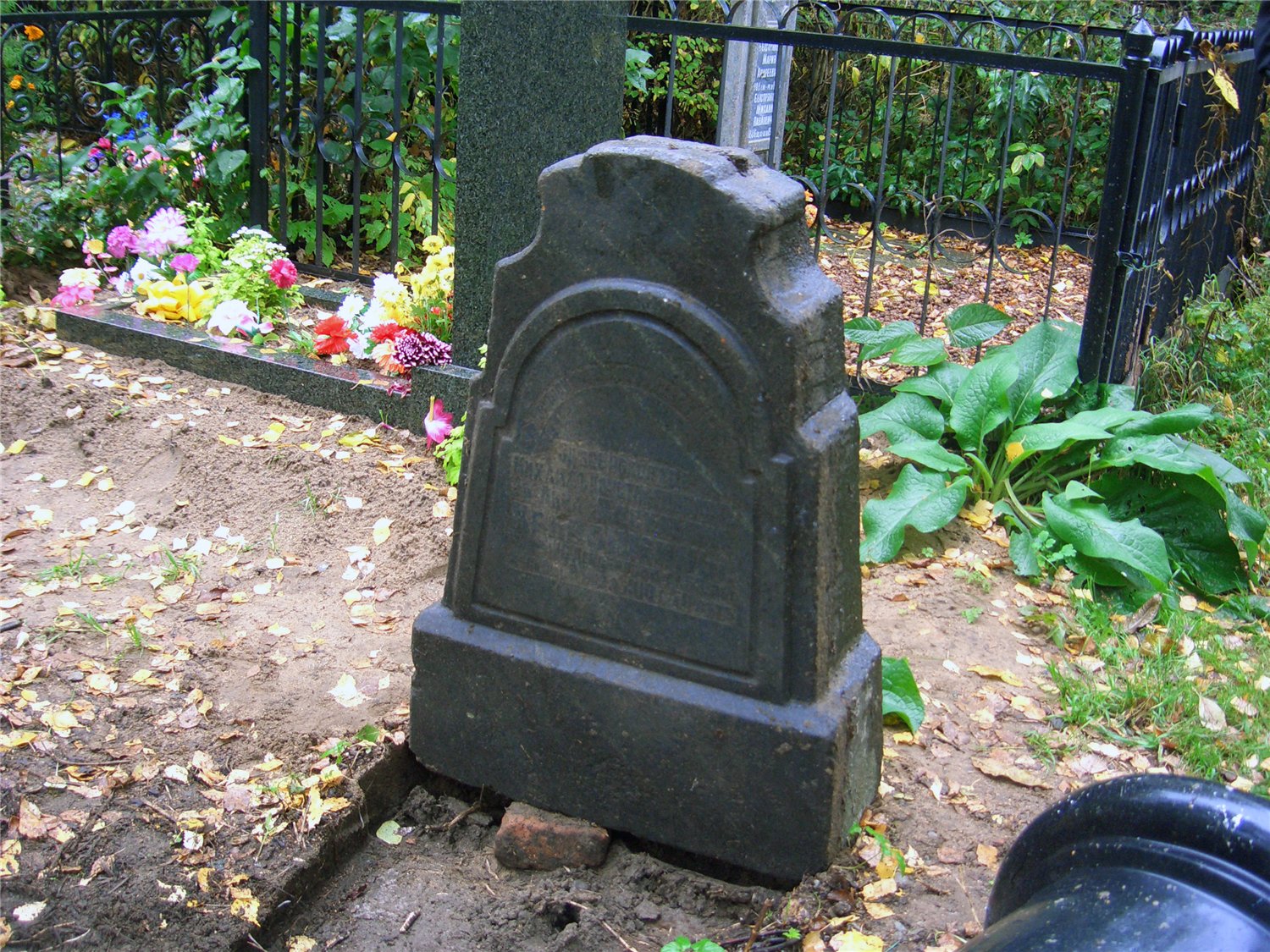 Одна из граней не читаема, верх надгробия повален и прислонён этой гранью к соседнему памятнику.