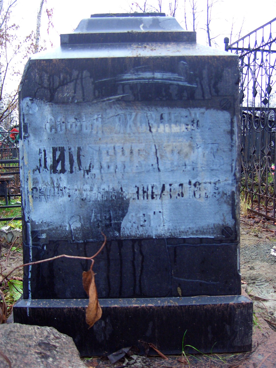 "Линденбаум Василий (Вильгельм) Фёдорович (1839-1895) - старейший врач Ярославской губернской земской больницы, известный хирург; доктор медицины; автор ряда научных публикаций в медицинской периодике. Захоронение несколько нет назад было разорено, памятник утрачен. Софья Яковлевна (1849-5.01.1899) - жена В.Ф. Линденбаума". (Ярославский некрополь. Леонтьевское кладбище. Справочник. - Ярославль: Ремдер, 2005. С. 59.)