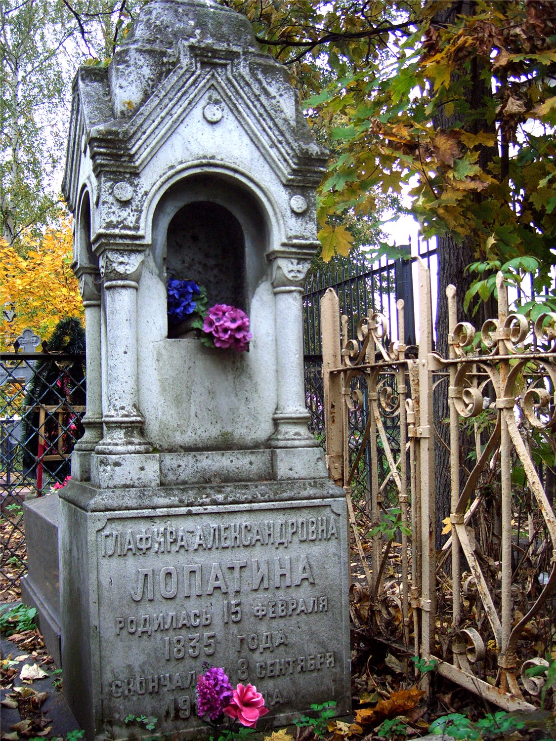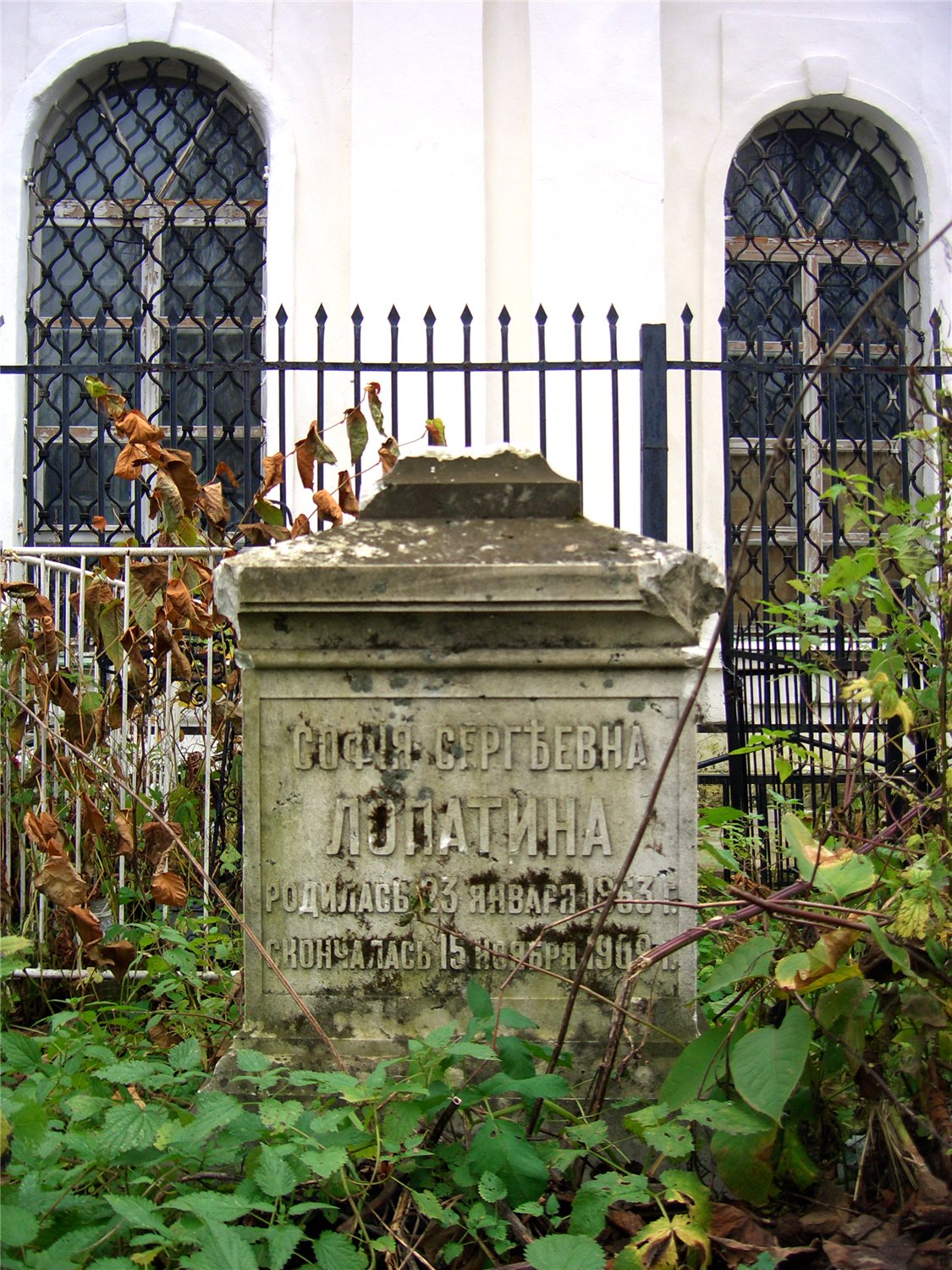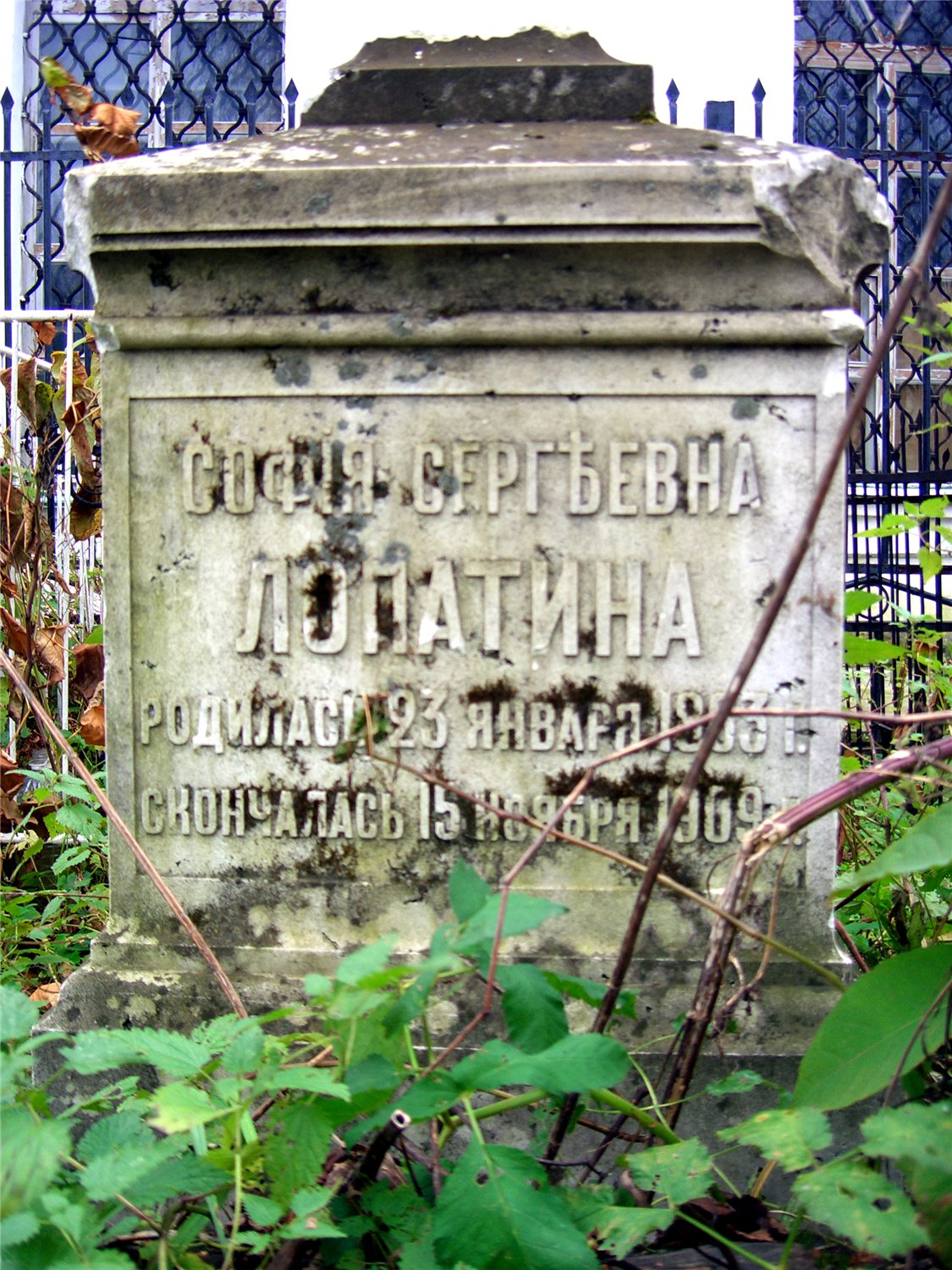 "...урождённая Пастухова - из семьи крупнейших ярославских купцов, потомственных почётных граждан, торговцев железом общероссийского масштаба и владельцев железоделательных заводов в Вятской губернии. Жена Г.С. Лопатина. После смерти мужа заняла его место в торговом доме "Братья Я. и Е. Лопатины"". (Ярославский некрополь. Леонтьевское кладбище. Справочник. - Ярославль, Ремдер, 2005. С.60-61.)