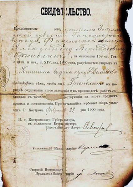 Свидетельство А. Б. Грюндблат на открытие фотографии в Кинешме. 1900 г. (ГАКО, ф. 133, б/ш, д. 677, л. 62)