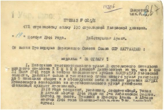 Приказ командира 100 стрелковой дивизии о награждении медалью «За отвагу»